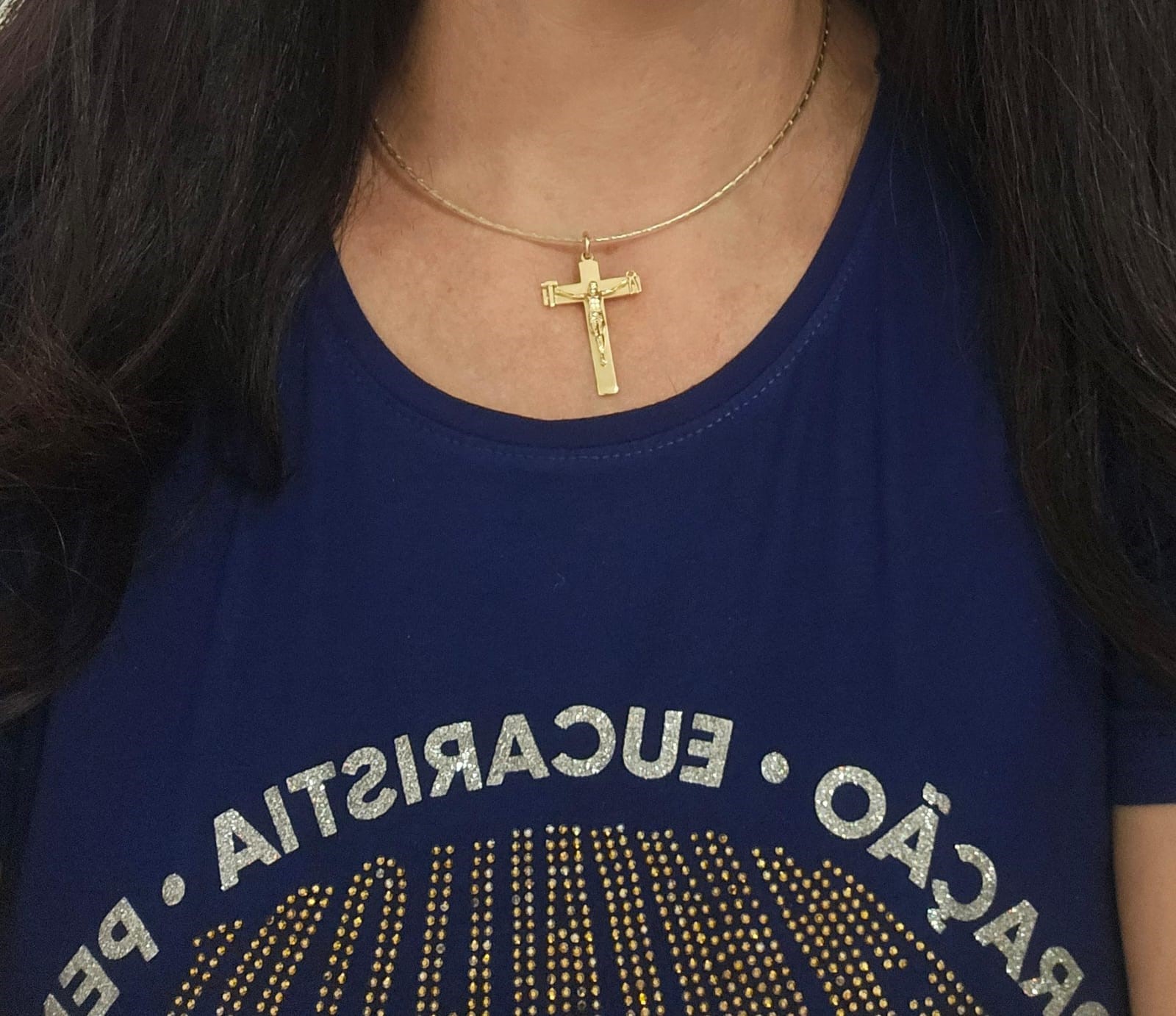 O Colar Aro é confeccionado com metal revestido de silicone, garantindo a durabilidade necessária a uma peça de proteção acompanha Cruscifixo Nossa Senhora de La Salette, produzido em metal Blend com camada de ouro 18k. Este é o Crucifixo que Nossa Senhora trazia sobre o coração em sua aparição em Salette, e possui uma peculiaridade: a torquês e o martelo fixados na cruz.