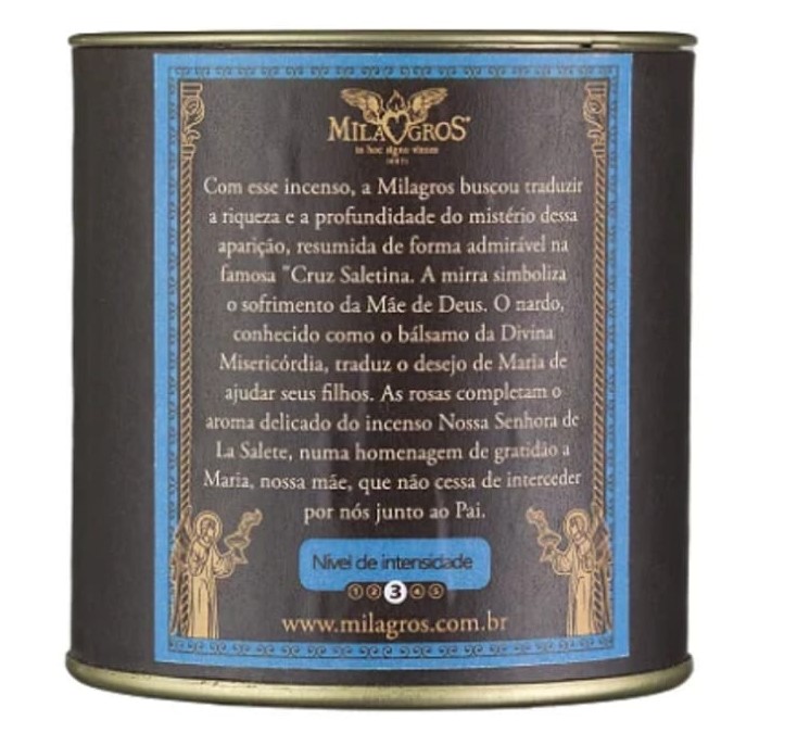 Com esse incenso, buscamos traduzir a riqueza e a profundidade do mistério dessa aparição, resumida de forma admirável na famosa “Cruz Saletina”, a cruz ladeada com um alicate e um martelo.